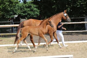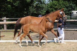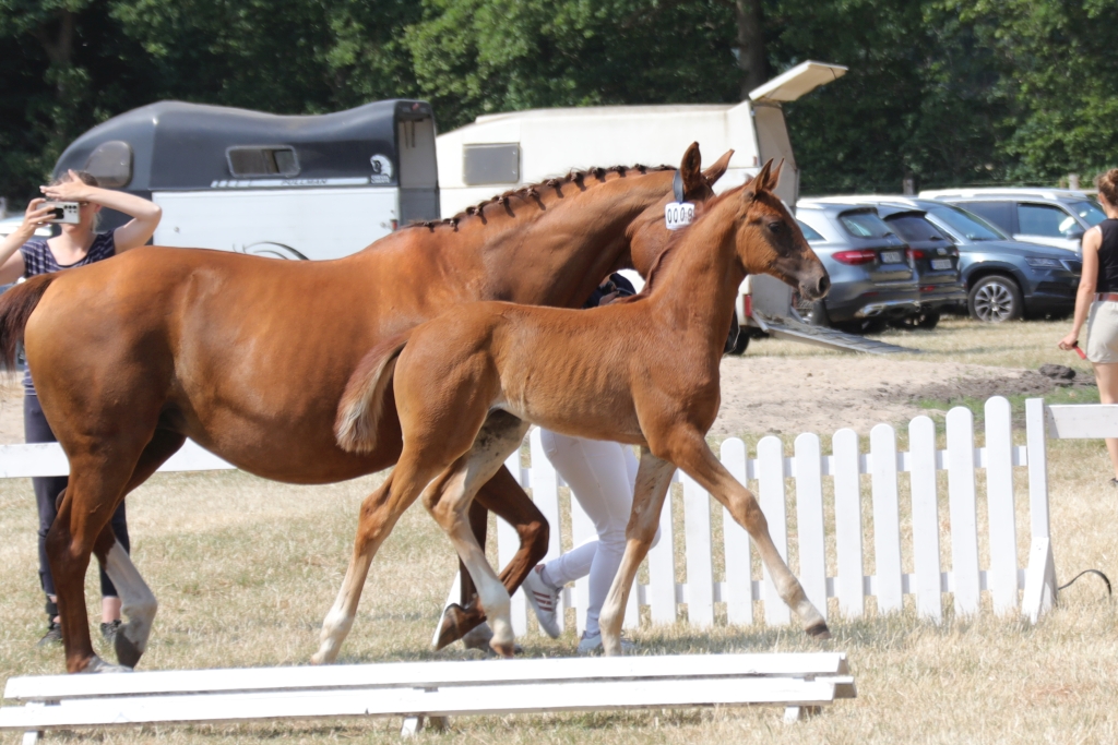 38 Fohlen waren genannt und 32 waren erschienen. Mit 25 gegenüber 7 Teilnehmern überwogen quantitativ die dressurbetonten Fohlen die Spring-Fohlen. Der Jahrgang 2023 hinterließ bei den Richtern, Hermann Jürgen Rump und Hartmut Kettelhodt, einen guten Eindruck. Die Fohlen wurden wie üblich in vier Klassen gerichtet: dressurbetonte Hengst- und Stutfohlen sowie springbetonte Hengst- und Stutfohlen. Aus jeder Gruppe wurden zunächst die Fohlen mit überdurchschnittlicher Qualität herausgefiltert. Diese wurden dann in Endringen miteinander verglichen und rangiert. Am Ende wurden zwei Sieger ausgewählt, jeweils in den Sparten Dressur und Springen. Darüber hinaus wurden einige Spitzenfohlen ausgewählt für die Online/Live-Fohlenauktion des Hannoveraner Verbandes in Verden am 04.08.2023 sowie für die Fohlenauktion Luhmühlen am 09.09.2023